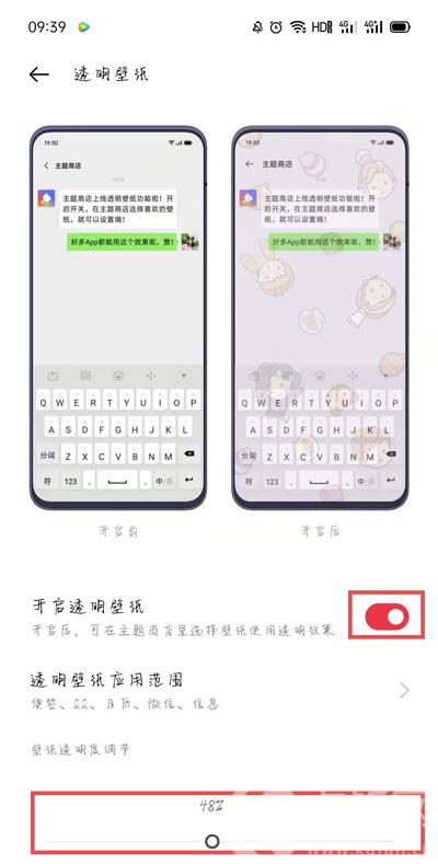 4、随后开启【开启透明壁纸】右侧的滑块,开启透明壁纸,在最下方设置壁纸透明度;