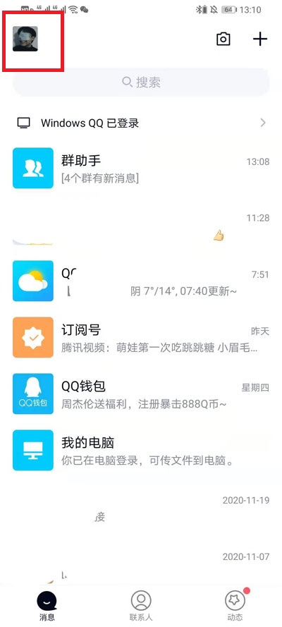 1、使用手机点击QQ进入到QQ中,点击左上角的【头像】;