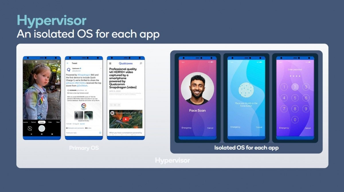 骁龙 888 还具有 Hypervisor,这一功能此前加入到面向 PC 的骁龙 8cx Gen 2 芯片中。这更多的是服务器和桌面的功能,因为它允许多个操作系统在同一硬件上运行,同时相互之间完全独立(所以,如果一个操作系统被破坏,其他操作系统的安全不受影响)。