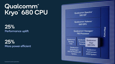 680 CPU 承诺比骁龙 865 芯片组的处理器性能提升 25%。功效也提升了 25%。