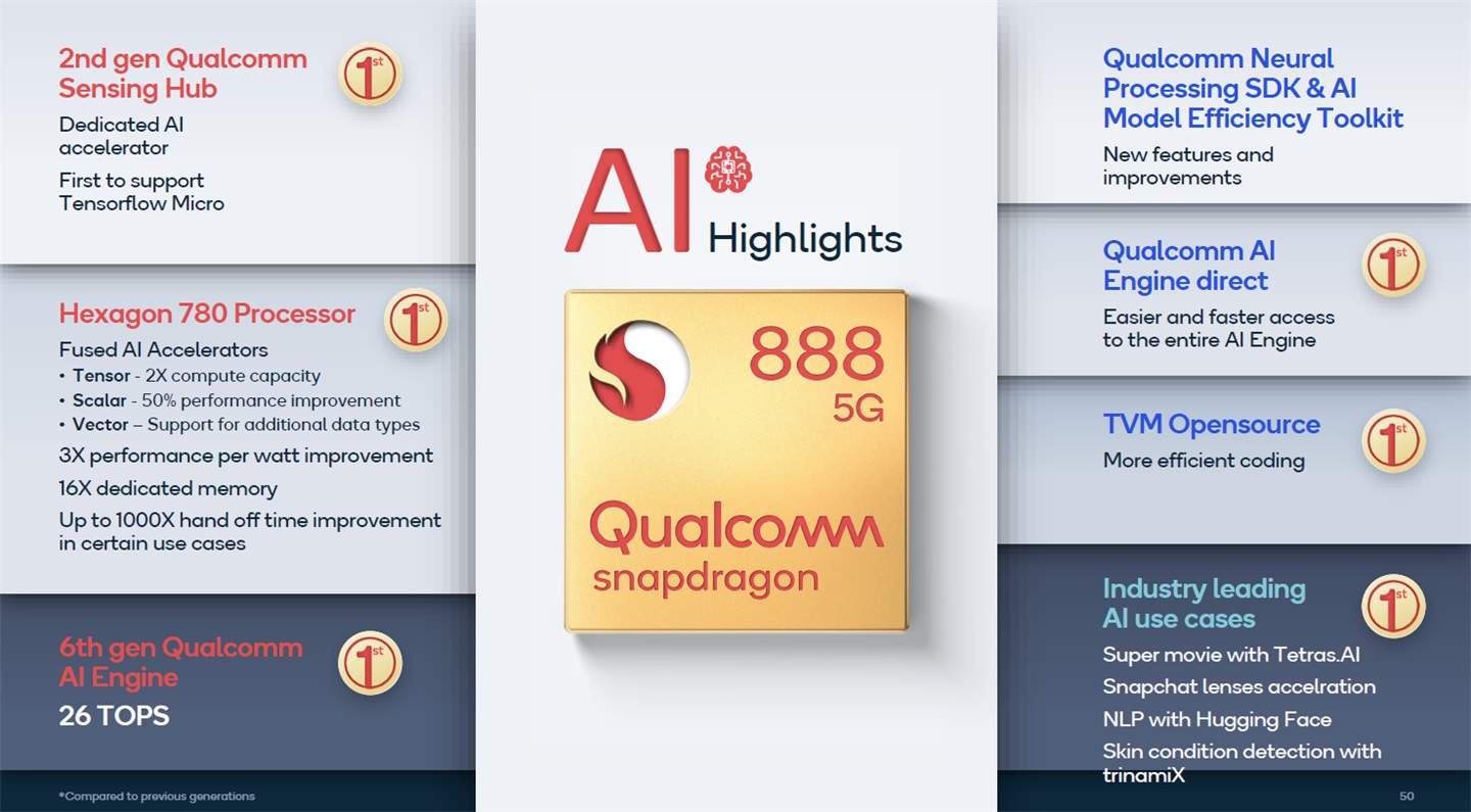 第六代 AI 引擎结合了全新的 Hexagon 780 和 GPU 的数字运算能力,提供了 26 TOPS(骁龙 S865 AI 算力是 15 TOPS)。功效也大幅提升,每瓦特的性能提升了 3 倍。