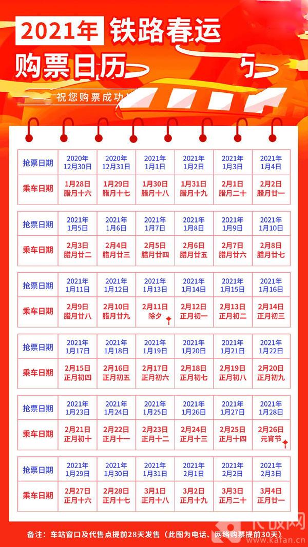 6、腊月廿八(2021年2月9日):2021年1月11日开始抢票;