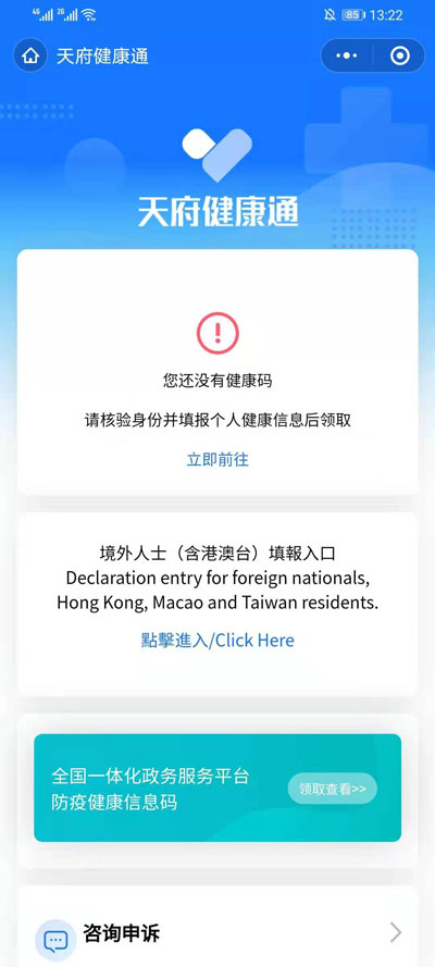4、在天府健康通中点击【立即前往】即可前往申请领取天府健康通,即可在成都地区使用此健康码。