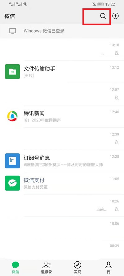 1.首先我们需要打开手机微信,进入到手机微信的聊天界面,点击右上方的【放大镜】进入到搜索界面;