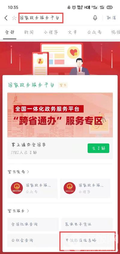 1、以微信为例,打开手机微信,搜索【国家政务服务平台】,然后点击搜索结果中的【申领防疫信息码】;