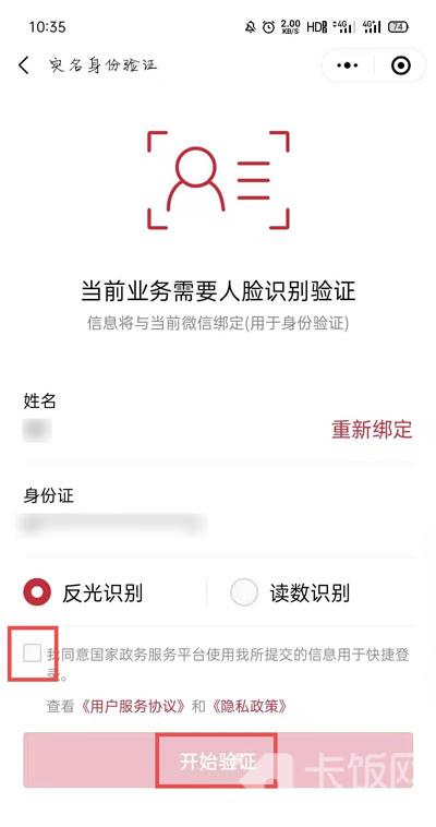 3、然后确定健康码绑定成员信息,进行人脸识别验证,可选择反光识别、读数识别选项;
