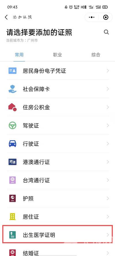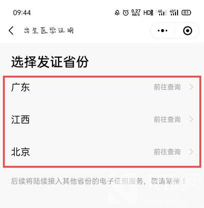 6.由于目前还未全部普及,可以选择添加的省份只有广东、江西、北京等省份,后续将继续接入其他身份的电子出生证照;