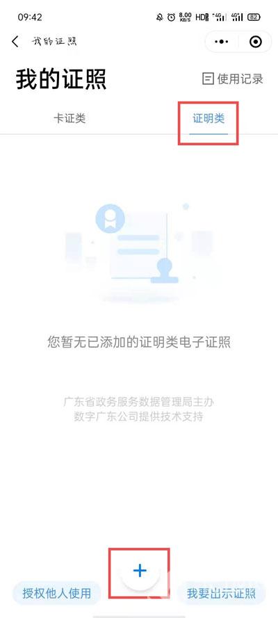 4.进入我的证照之后,在“证明类”的下方,选择【+】添加按钮;