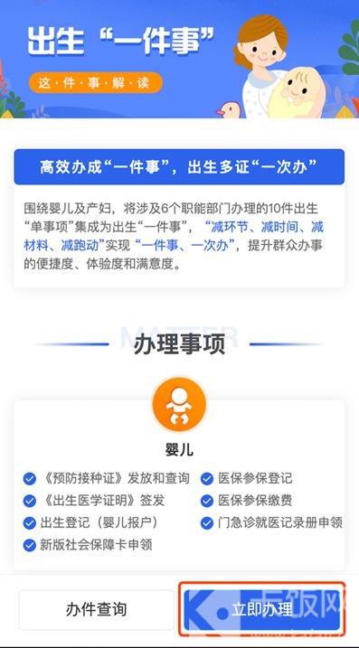 2、或者直接在随申办中,搜索【出生一件事】,然后点击【立即办理】;
