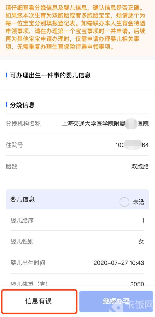 5、随后就会获取生育时在医院填写的个人信息、婴儿信息,确认信息是否有误,再【继续办理】;