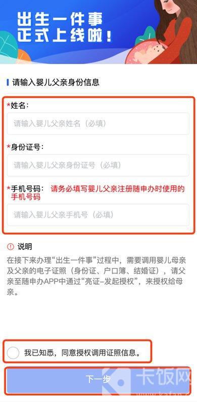 3、进入办理页面之后,输入婴儿的父亲身份信息,勾选“我已知悉……”,点击【下一步】;