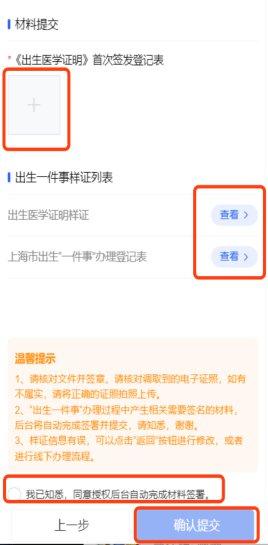 7、在所有信息填报完成之后,需要上传纸质的出生医学证明首次签发登记表,然后勾选“我已知晓……”,点击【确认提交】;