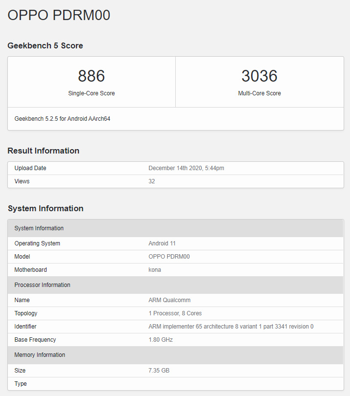 Reno5 Pro + 已出现在 Geekbench 的测试平台上。在 Geekbench 5 上,Reno5 Pro + 在 Geekbench 5 的单核和多核测试中,分别获得了 886 分和 3036 分。