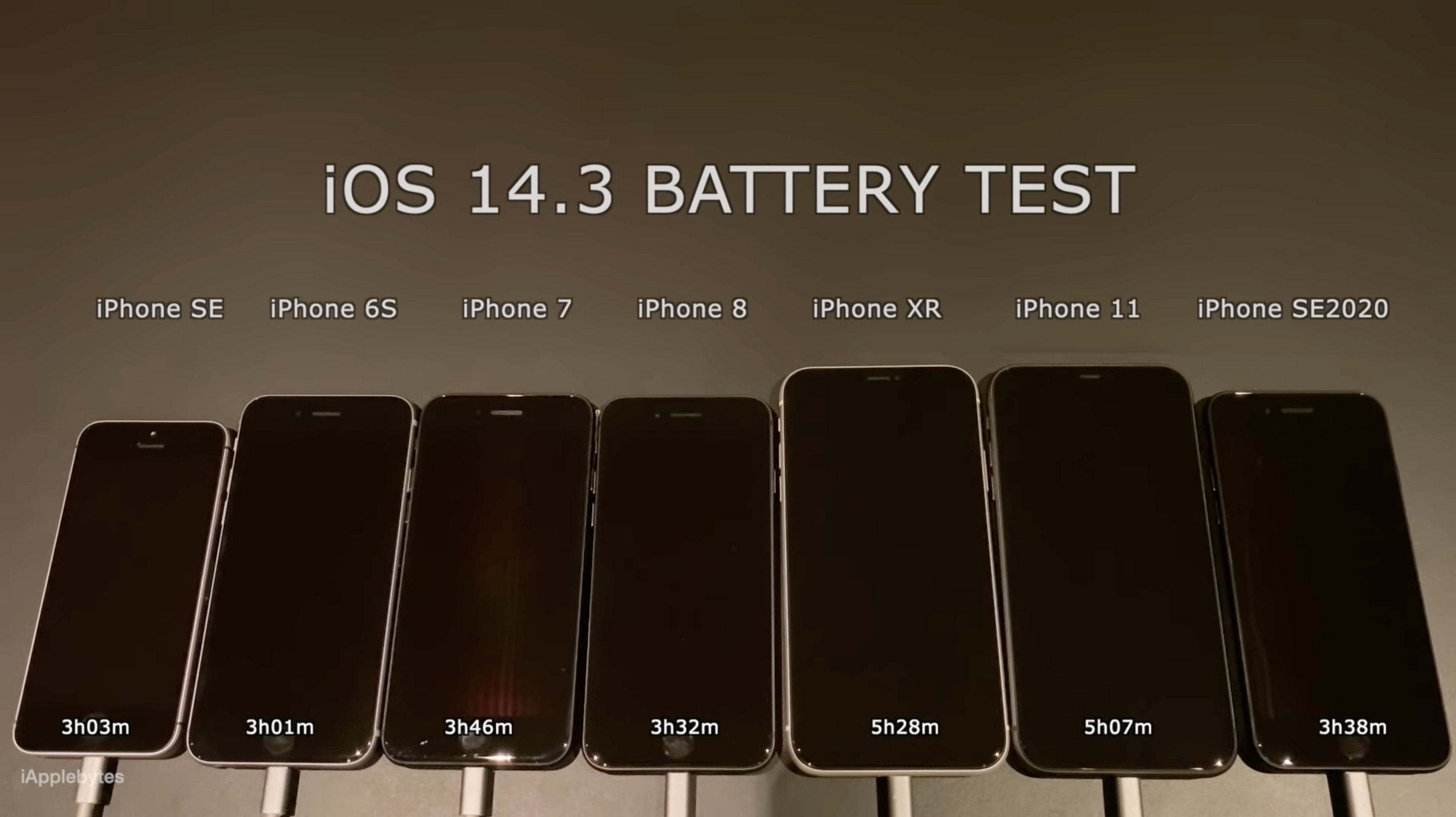 在运行 iOS 14.3 RC2(版本号 18C66 和正式版一致)的八部不同设备上运行了续航测试,这八款机型分别为 iPhone SE / 6S / 7 / 8 / XR / 11 / SE2,电池健康最大容量分别为 98% / 100% / 100% / 99% / 95% / 100% / 98%。