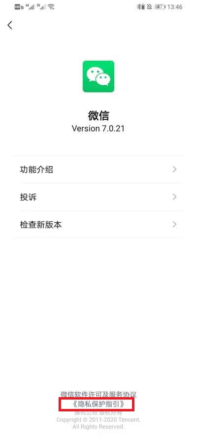 4、在关于微信界面,点击下方的【隐私保护指引】进入到隐私保护条款文章中;