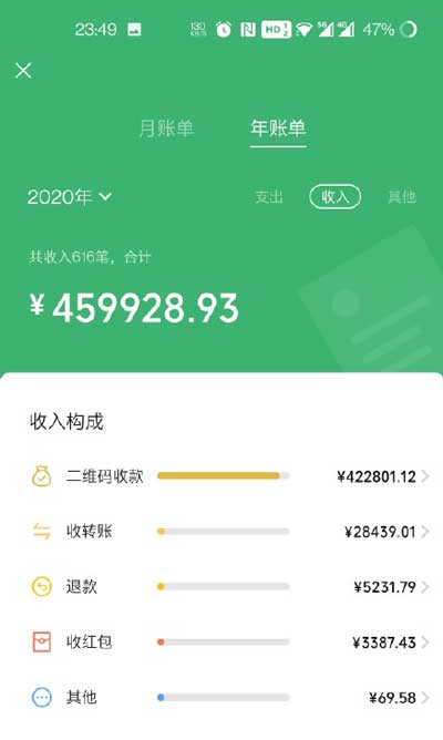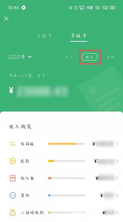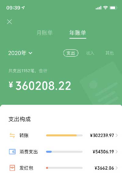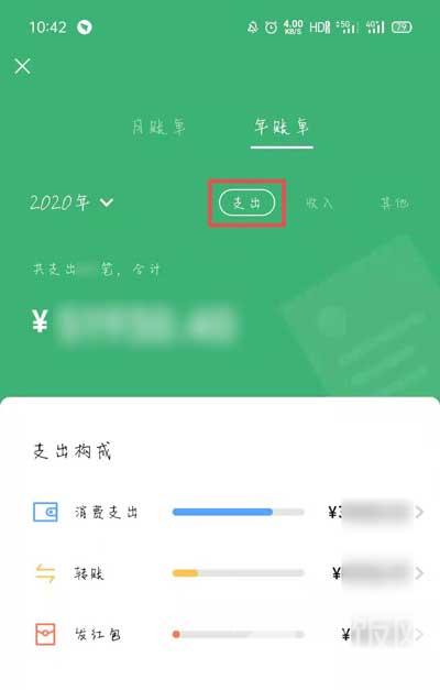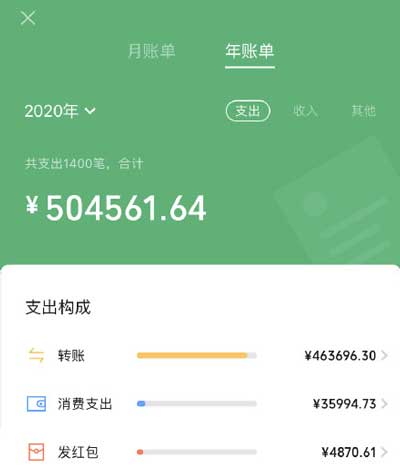 5.最后,点击上方的【年账单】,切换查看年度账单,切换【支出/收入/其他】查看构成;