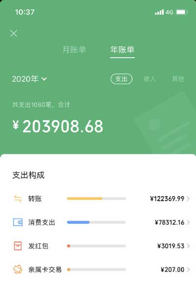 6.支出构成会显示你的消费支出、转账、发红包、亲属卡交易等多种类型的消费统计,点击进入可查看详细账单;