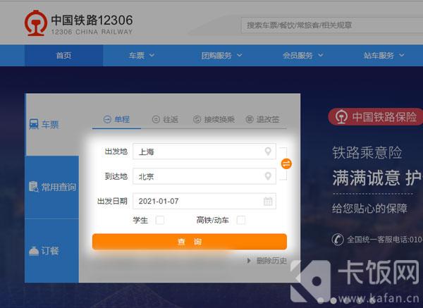 6.打开铁路12306官网,同样登录自己的账号之后,在首页设置好出发地、目的地、出发日期,点击【查询】;