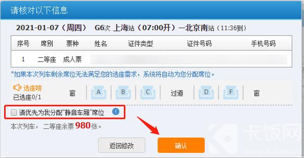 9.在弹出的核对信息窗口中,选择自己需要乘坐的座位,勾选左下角的【请优先为我分配“静音车厢”席位 】,点击【确定】即可。