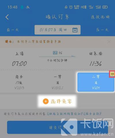 5.添加乘客之后,在下方的选座服务中,勾选【请优先为我分配“静音车厢”席位】,然后再选择你想坐的位置,点击【提交订单】即可;