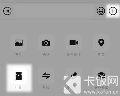 6.接着点击右侧的【+】菜单按钮,展开菜单,选择【红包】发红包;