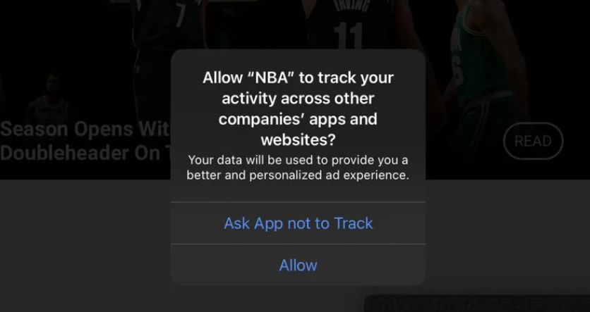 论坛内,有用户分享了 NBA App 试图跟踪用户活动的弹窗,系统提示称该应用正在请求”在其它 App 和网站内追踪你的个人活动“,且表示 App 所获得的数据会为用户提供更好的,个性化的广告体验。