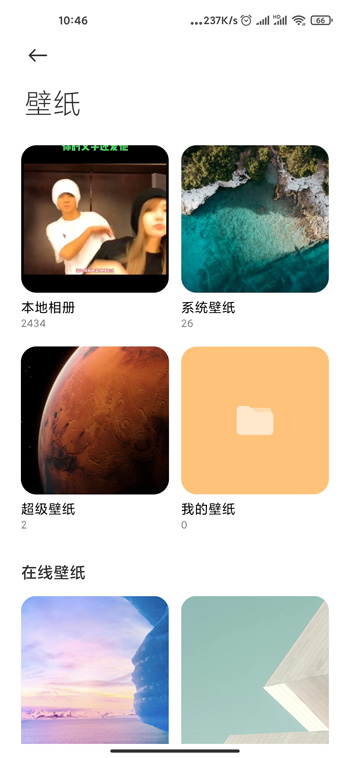 3.进入壁纸界面中后,我们可以选择设置超级壁纸、设置锁屏桌面息屏等壁纸功能,可以选择系统预设壁纸或者是自己喜欢的锁屏壁纸。