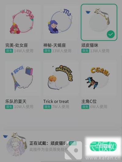 5.切换到头像挂件设置后,在所有的头像挂件中,找到自己想要使用的一个头像挂件,然后点击下方的【立即佩戴】;