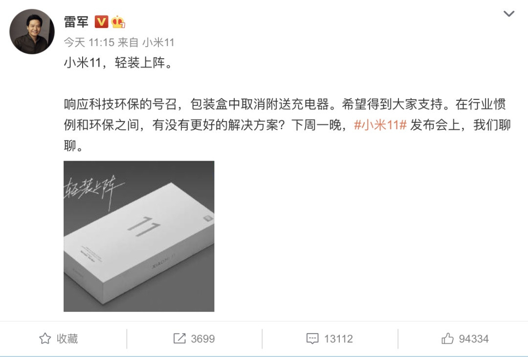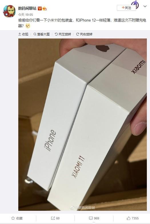 目前看来是真的,但是小米雷军说有更好的解决方案,所以取消赠送充电器是真的,但是肯定会有相对较好的解决方法。对于小米而言很苹果走一眼的路线还为时尚早。最近的微博博主也爆出了关于小米11包装盒的照片,照片中小米11的包装盒和苹果12一样轻薄,看样子就是没有配备充电器的。