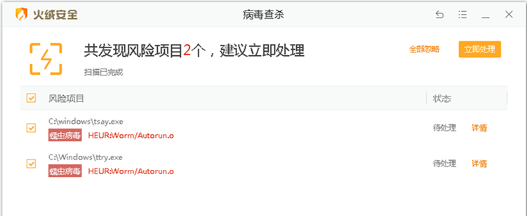补充:查杀完成,部分用户会发现电脑生成了一个SystemVolumeInformation的隐藏文件夹,这个不是病毒,实际上是系统自动生成的还原点信息文件,所以不用担心。