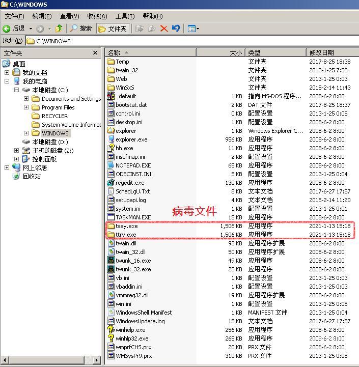 打开电脑C盘,查看C:\Windows的下方是否存在【tsay.exe】、【ttry.exe】文件,如果就表示电脑中了incaseformat病毒。