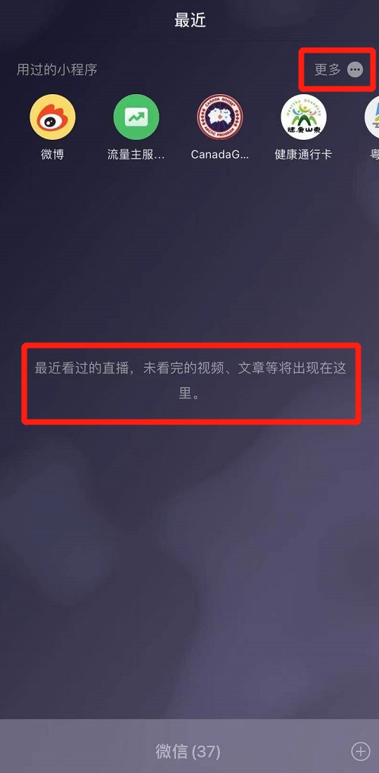 微信下拉菜单也发生了变化,用过的小程序被收到顶层,只展示最近用过的 5 到 5 个,如果需要查看更多小程序,可以点击右上角的更多。