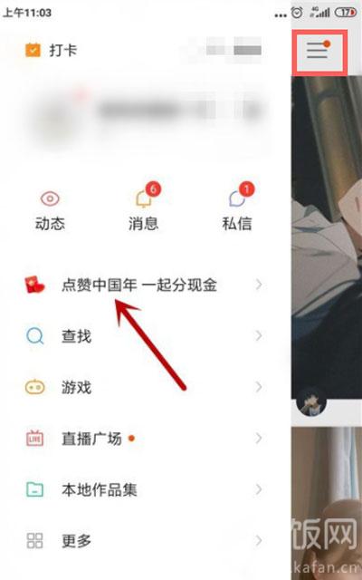 1.打开手机中的快手,在首页点击左上角的三条杠【更多】,进入菜单页面,选择【点赞中国年 一起分现金】;