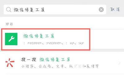 1、打开手机上的微信,在首页搜索【微信修复工具】,点击功能进入使用;