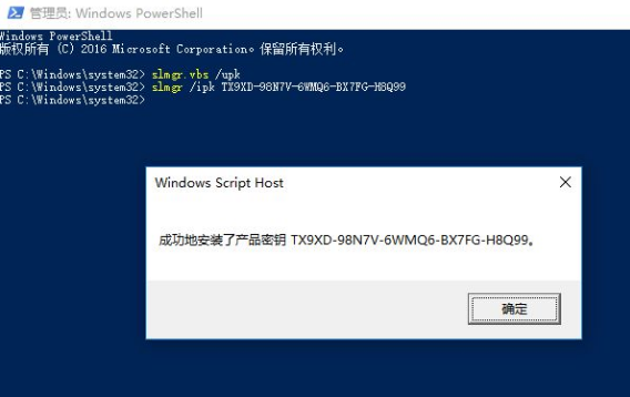 3.输入【slmgr /ipk TX9XD-98N7V-6WMQ6-BX7FG-H8Q99】按【回车】执行,弹出窗口显示【成功地安装了产品密钥】