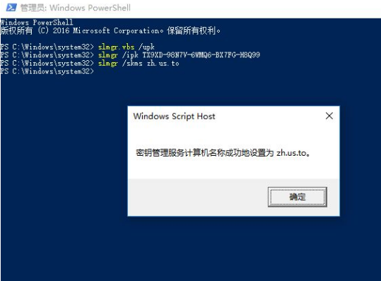 4.输入【slmgr /skms zh.us.to】按【回车】执行,弹出窗口提示【密钥管理服务计算机名称成功地设置为zh.us.to】