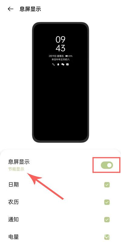 3、点击【息屏显示】右侧的滑块开启息屏,点击左侧可切换模式,在下方可选择对应的类型;