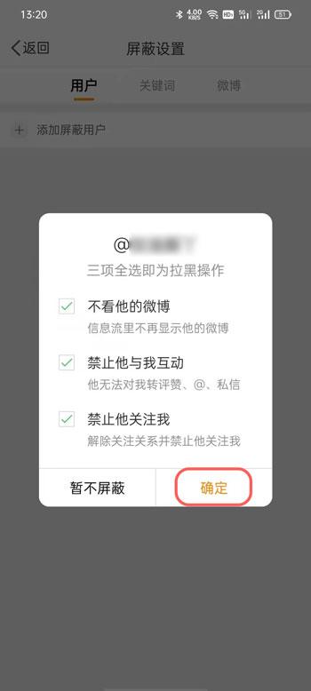 4、选择需要拉黑的操作选项,点击【确定】按钮即可成功拉黑对方;