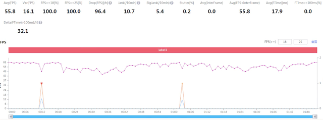 然后是骁龙870极低画质无动态60帧模式,跟高画质差别不大,帧率稳定在55.8FPS,机身温度:42度,CPU温度:61.2度!