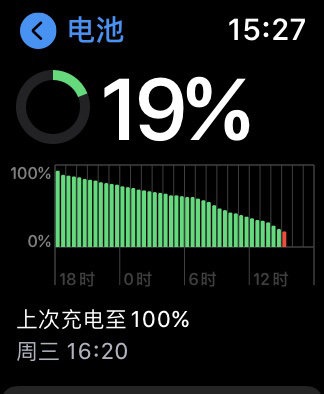 续航和充电是大部分智能手表用户最关心的环节,在苹果官网上,Apple Watch Series 6 的续航仍然被标注为 18h,但是经过一天的高强度测试(期间全程连接 WiFi、全天开启心率检测并进行了约 50 分钟的锻炼),23 小时后电池仍然剩余 19%,可见在 LTPO 显示屏的加持下,Apple Watch Series 6 绝对是不止 18h 的,属于是一天以上,两天未满的水平。