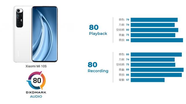 小米 10S 手机在尚未发布的时候就获得了DxOMark 的音质评测,这款手机凭借经过哈曼卡顿调校认证的对称式双扬立体声,以 80 分的成绩夺得 DxOMark 手机音频排行榜第一名,录音以及外放均为第一。