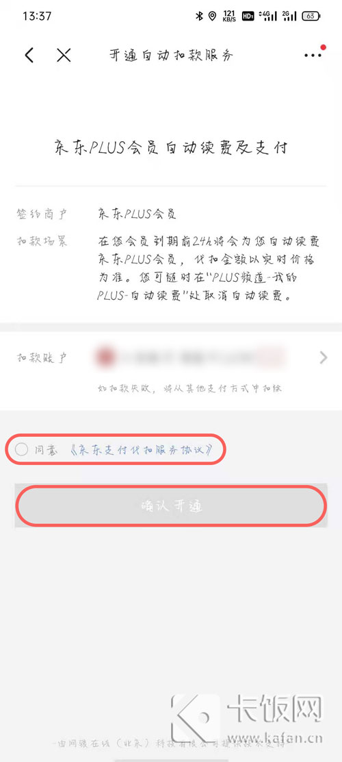 5、选择扣款账户(试用结束将自动购买下个月会员,点击这里查看取消自动续费),勾选【同意……】,点击【确认开通】;