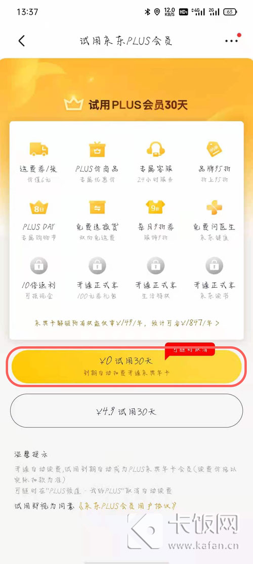 4、在使用京东plus会员详情页面,点击【0元试用30天】按钮;