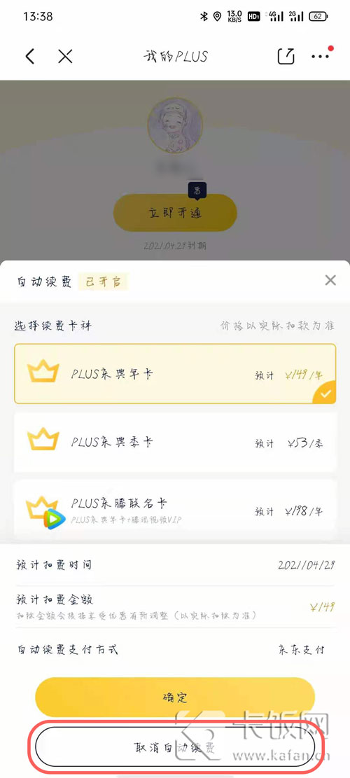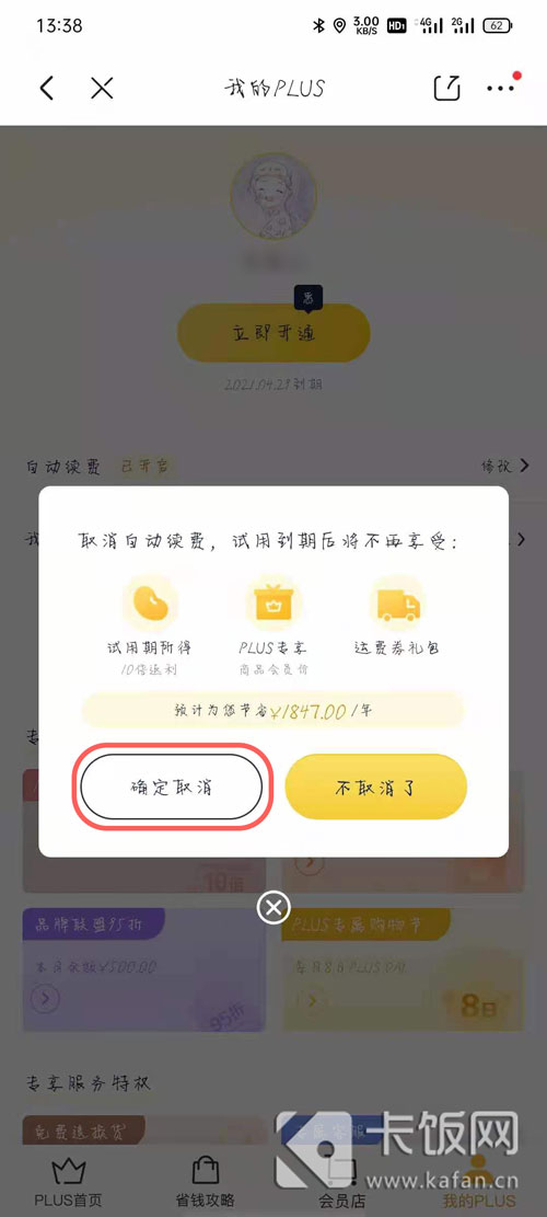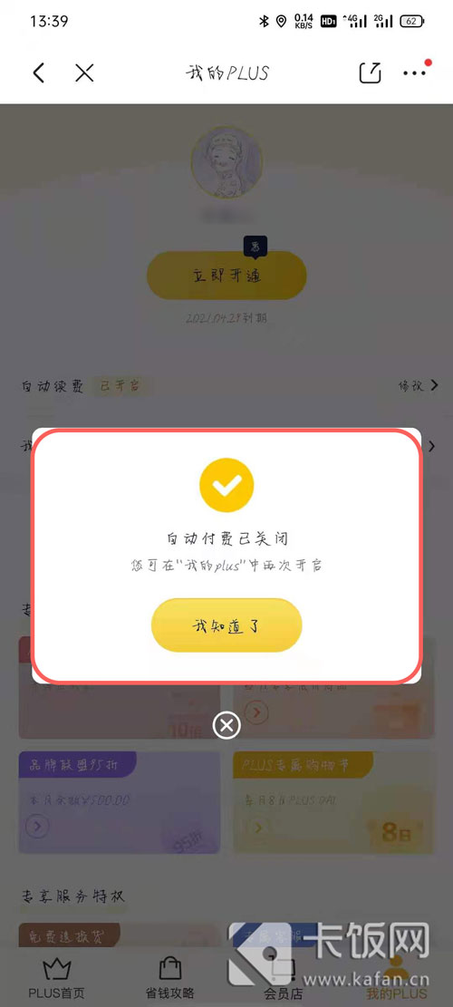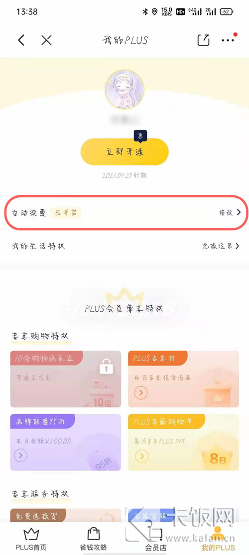 3、进入我的plus页面,点击下方的【自动续费】进入修改;