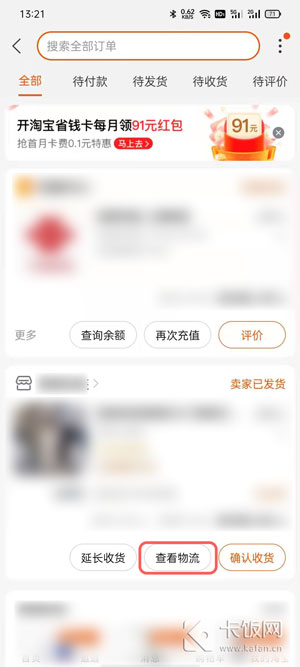 3、在全部订单中,找到自己需要送货上门的订单,点击【查看物流】;