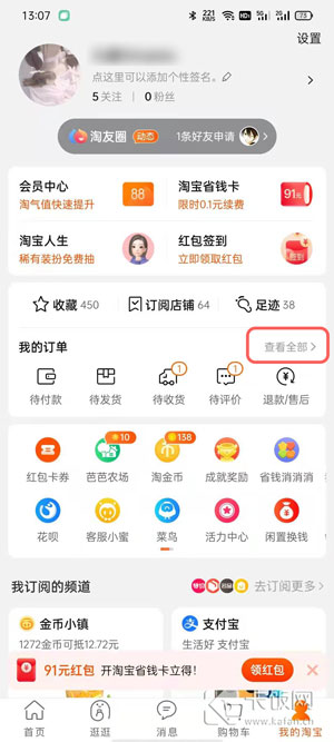 2、进入我的淘宝页面后,点击下方的【查看全部】;