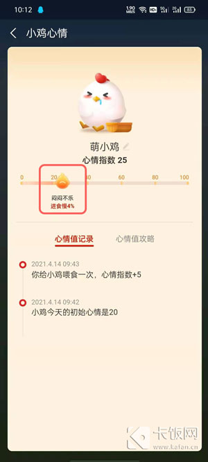 5、如果您的小鸡太久没有喂食,则会降低进食速度,可通过喂养、玩耍、换装等方法提升心情值,具体点击这里查看攻略。