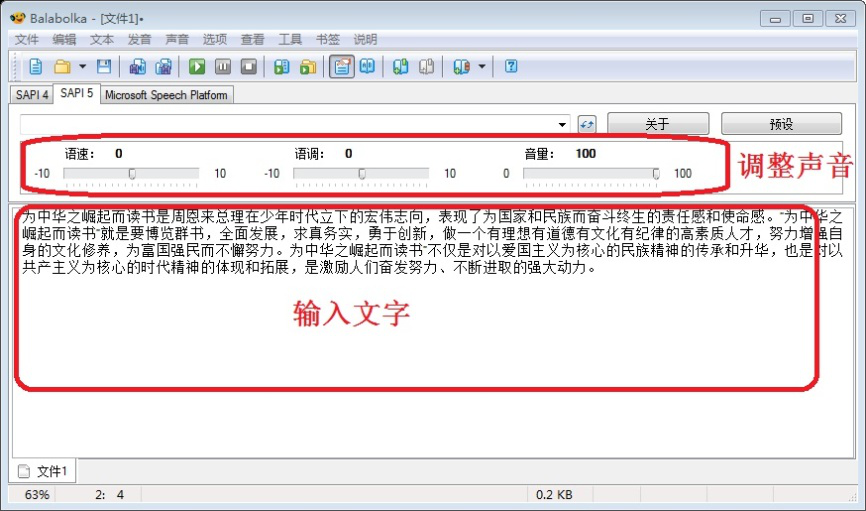 1. 打开 Balabolka 软件,在界面下方的空白处输入用户需要转换成语音的文字,然后根据需要自行调节语音的语速快慢、语调高低和音量大小。
