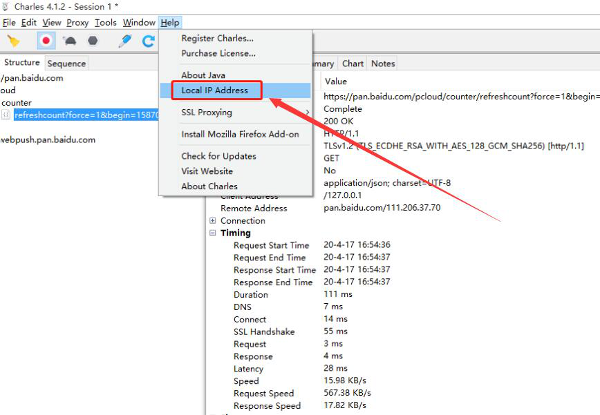 5. 再切换至 Charles 的“Help”菜单,点击“Local IP Address”。