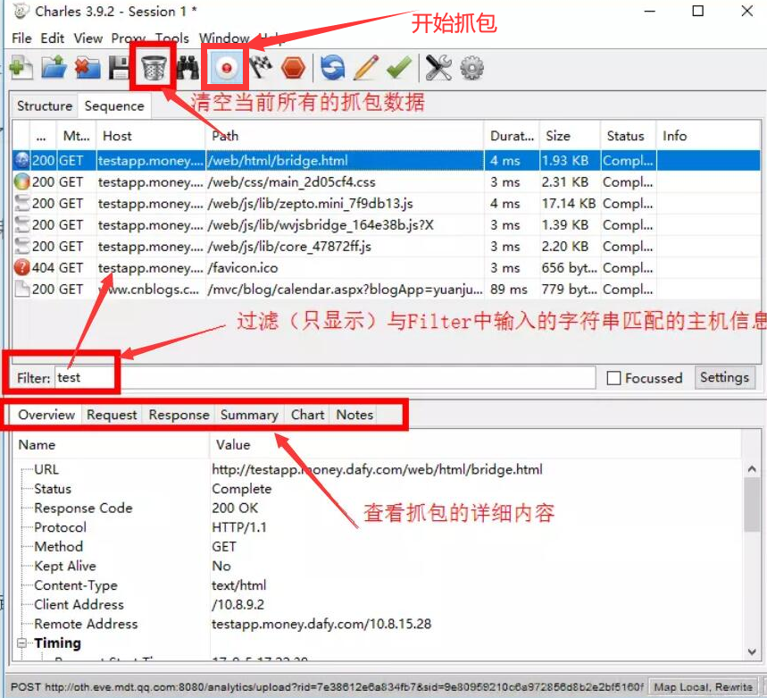 11. 最后,我们回到 Charles 主界面,点击“抓包”的红色按钮,Charles 便开始抓包。抓包完成后,我们可以在界面下方查看 Charles 抓包的详细内容。当然了,如果想清空当前的抓包数据,也可以点击清空按钮一键删除。